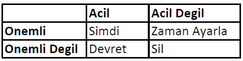 Ozetle, acil onemli bir is ise, hemen yapiyor; onemsizse baska birisine yaptiriyor. Acil degilse, takvim atiyor. Acil degil ve onemsizse yapmiyor.