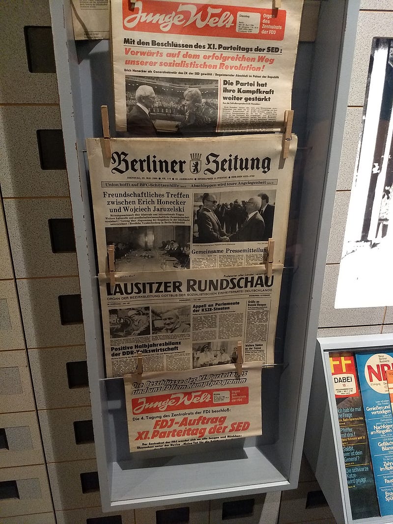 Dogu Alman basini fazlasiyla sansürlenmis. Her carsamba günü, farkli alanlardaki medya editörleri toplanip, ne yazmalari gerektikleri konusunda direktifler aliyorlarmis. Bir de gazetelerde zorunlu bir bölüm varmis. Ismi ‘Yeni Almanya’. O kadar garip ki, bu isim daha önce Hitler döneminde de kullanilmis. Sadece Almanya’da degil dünyanin farkli yerlerinde, farkli ülkelerde, farkli ideolojilerce de ‘yeni’ kavrami bircok kez tekrar edilmis, ve ediliyor.