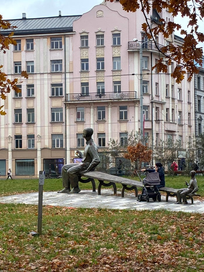 Kütüphanenin kapısı önünde de, ilginç bir heykel vardı. Rainis. Letonya’nın en büyük şairi, düşünürü ve özgürlük hayalperesti. Bu heykelde iki Rainis var. Biri küçük, biri büyük. Biri geçmiş, biri olgunluk. Okudukça büyürsün diyordu adeta.